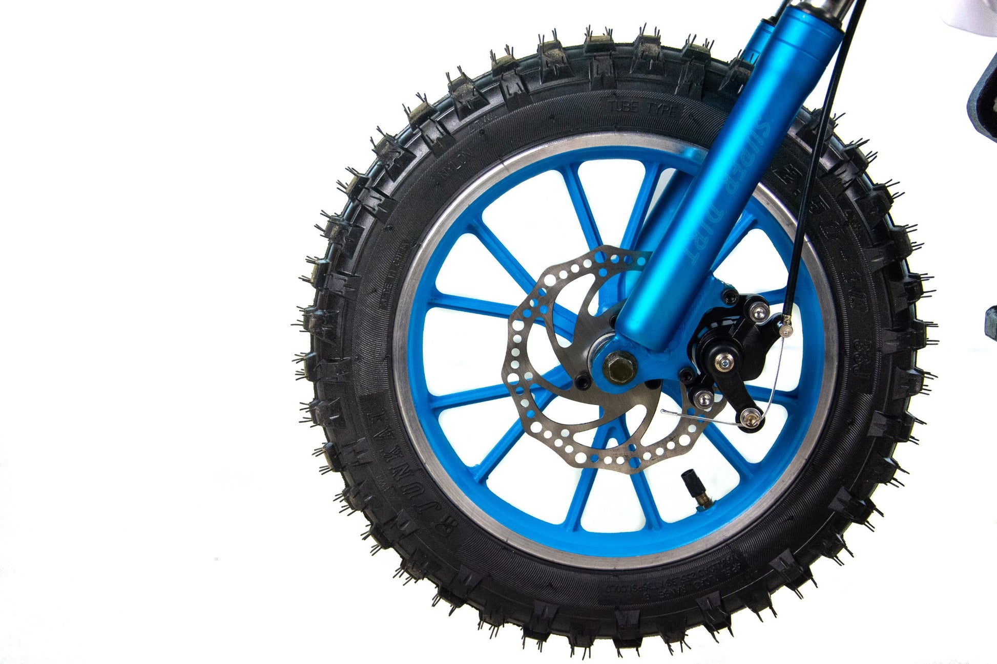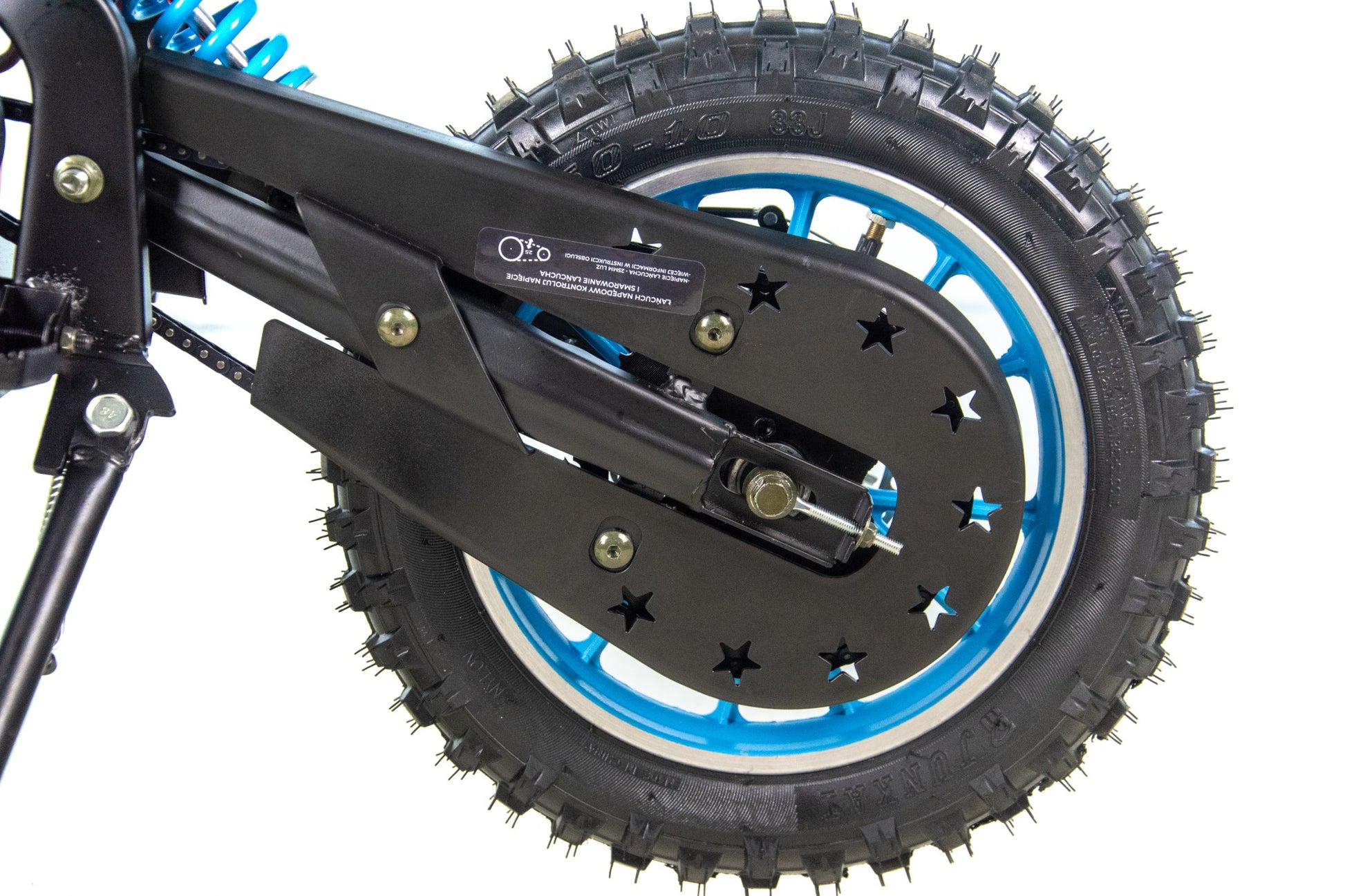 Mini cross zestawiony jest na 10-calowych obręczach aluminiowych wyposażonych w kostkowe opony terenowe