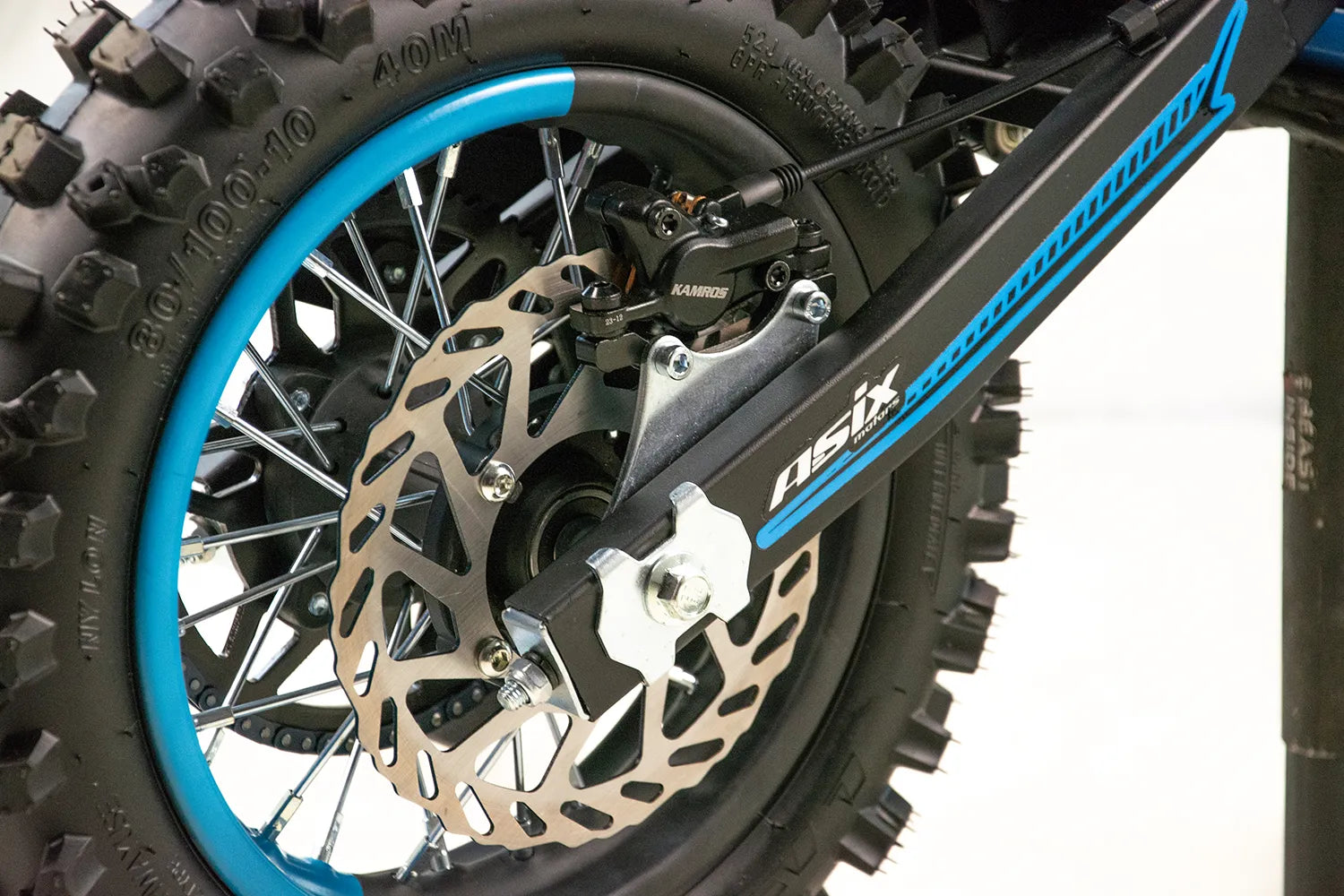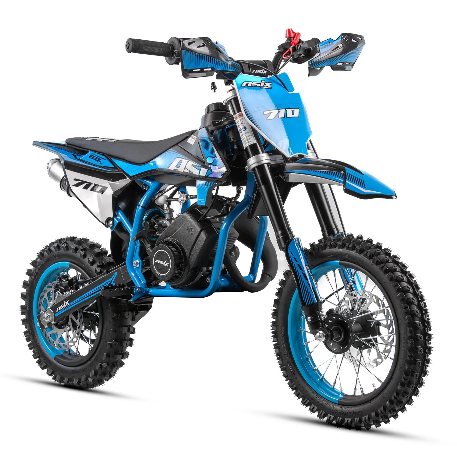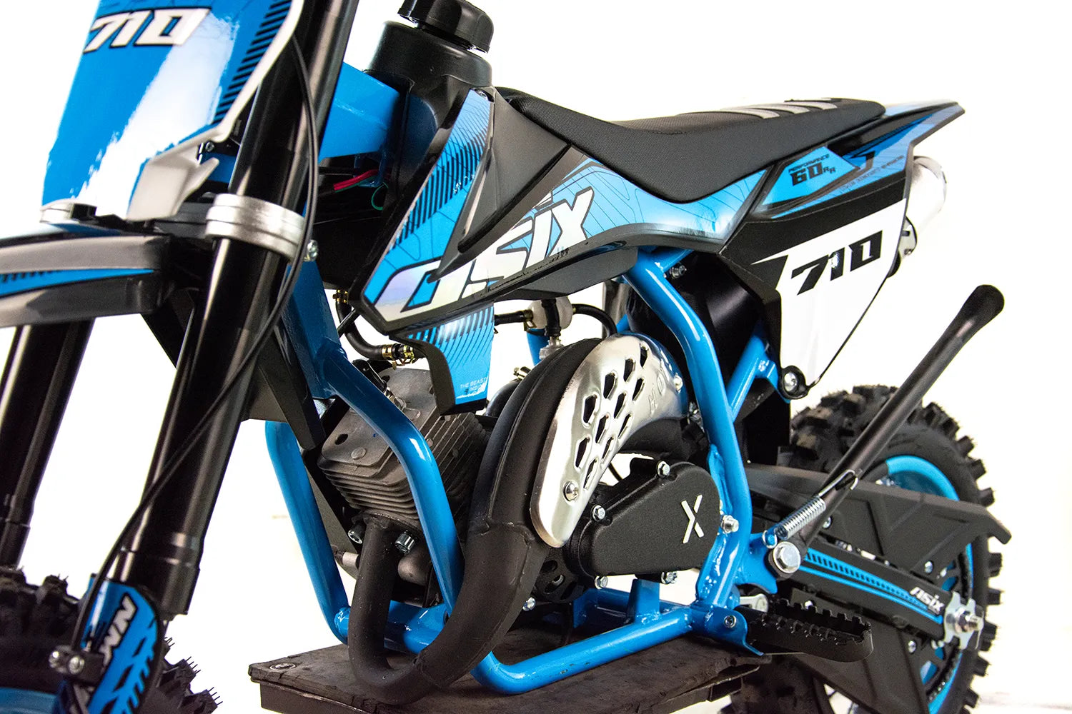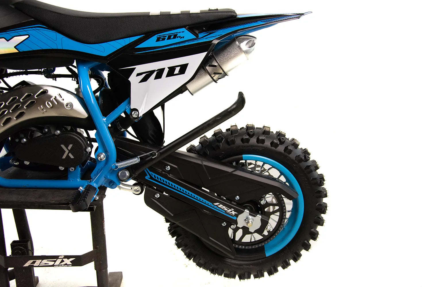 Mini cross ASIX 710 to pojazd z silnikiem dwusuwowym (2T) o pojemności 60cm3. Przeznaczony dla dzieci w wieku 6-10 lat. Cross zestawiony na kołach 12/10″, wyposażony w hamulce hydrauliczne, zrywkę bezpieczeństwa oraz amortyzatory olejowe