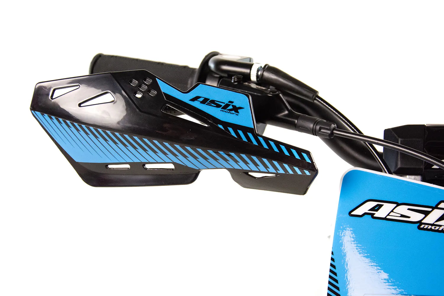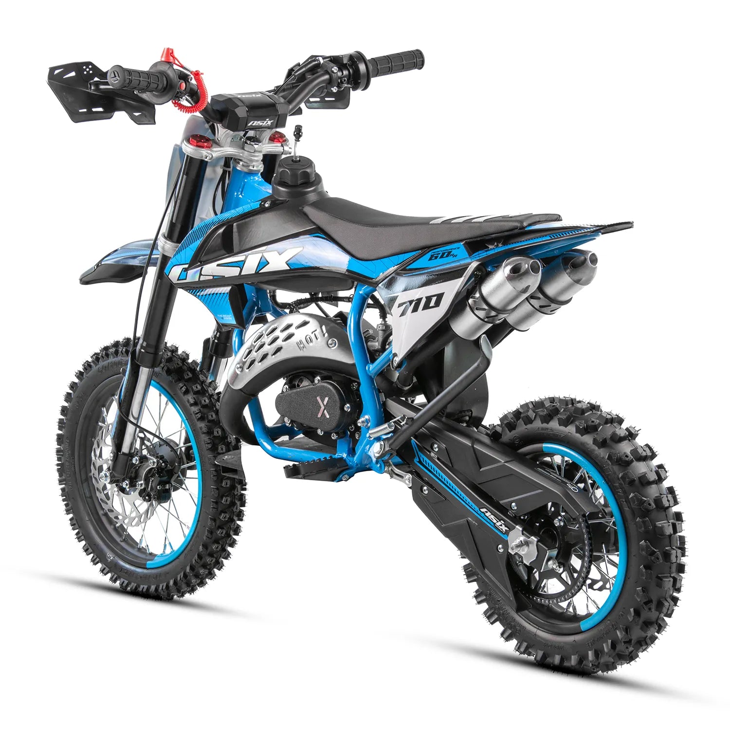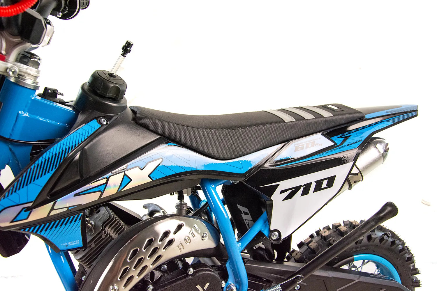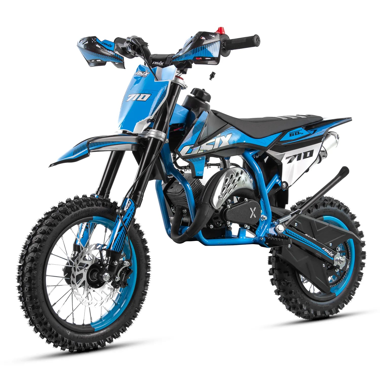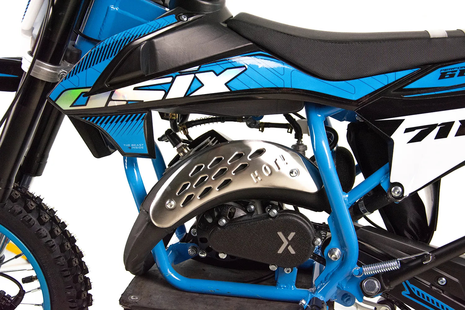 Mini cross ASIX 710 to pojazd z silnikiem dwusuwowym (2T) o pojemności 60cm3. Przeznaczony dla dzieci w wieku 6-10 lat. Cross zestawiony na kołach 12/10″, wyposażony w hamulce hydrauliczne, zrywkę bezpieczeństwa oraz amortyzatory olejowe