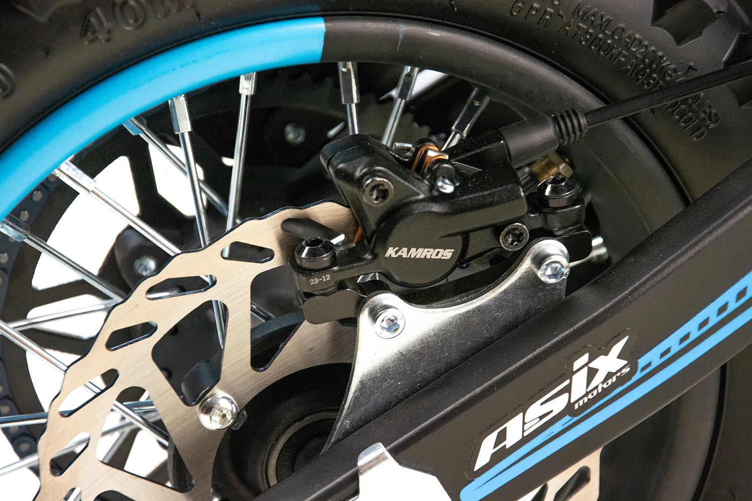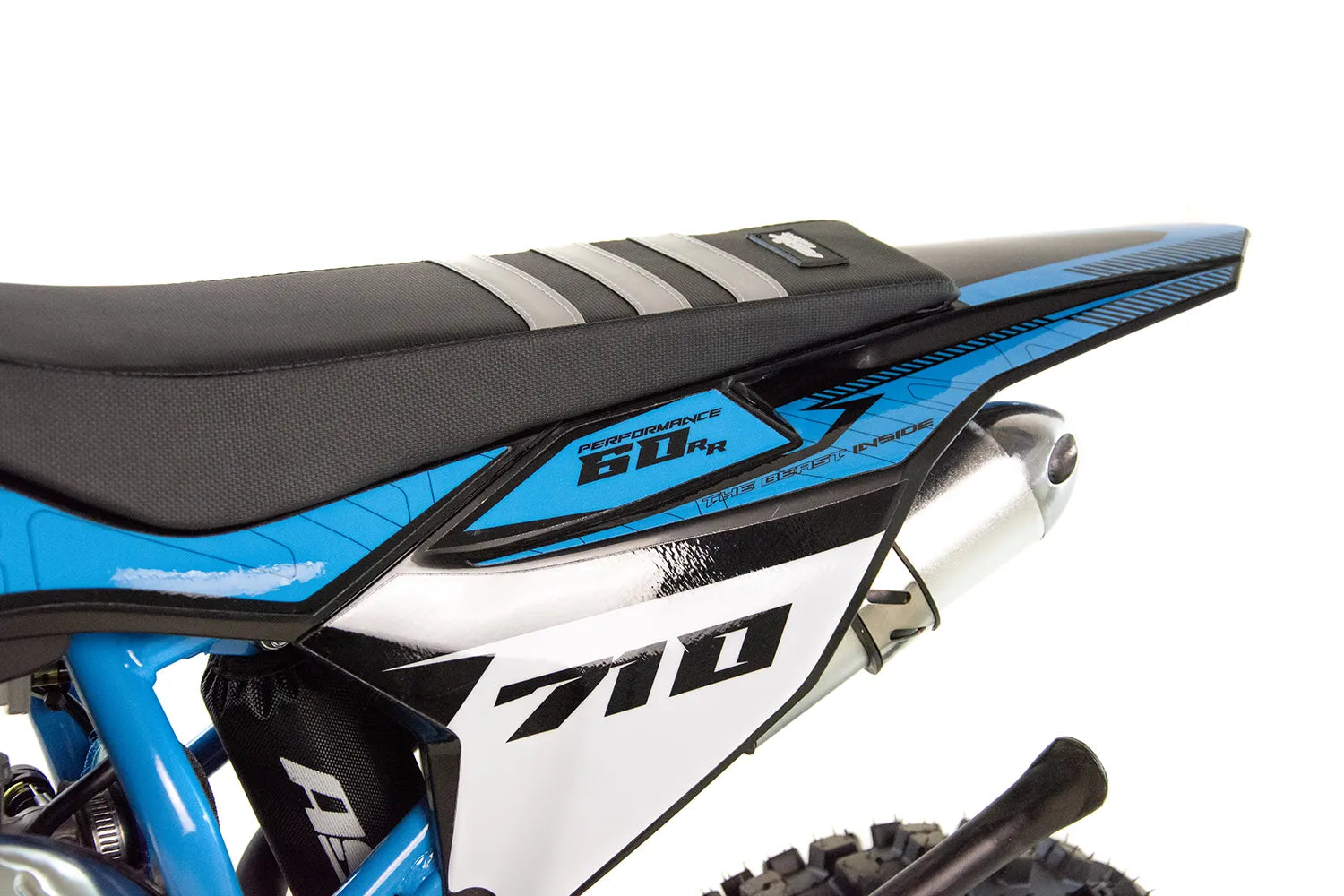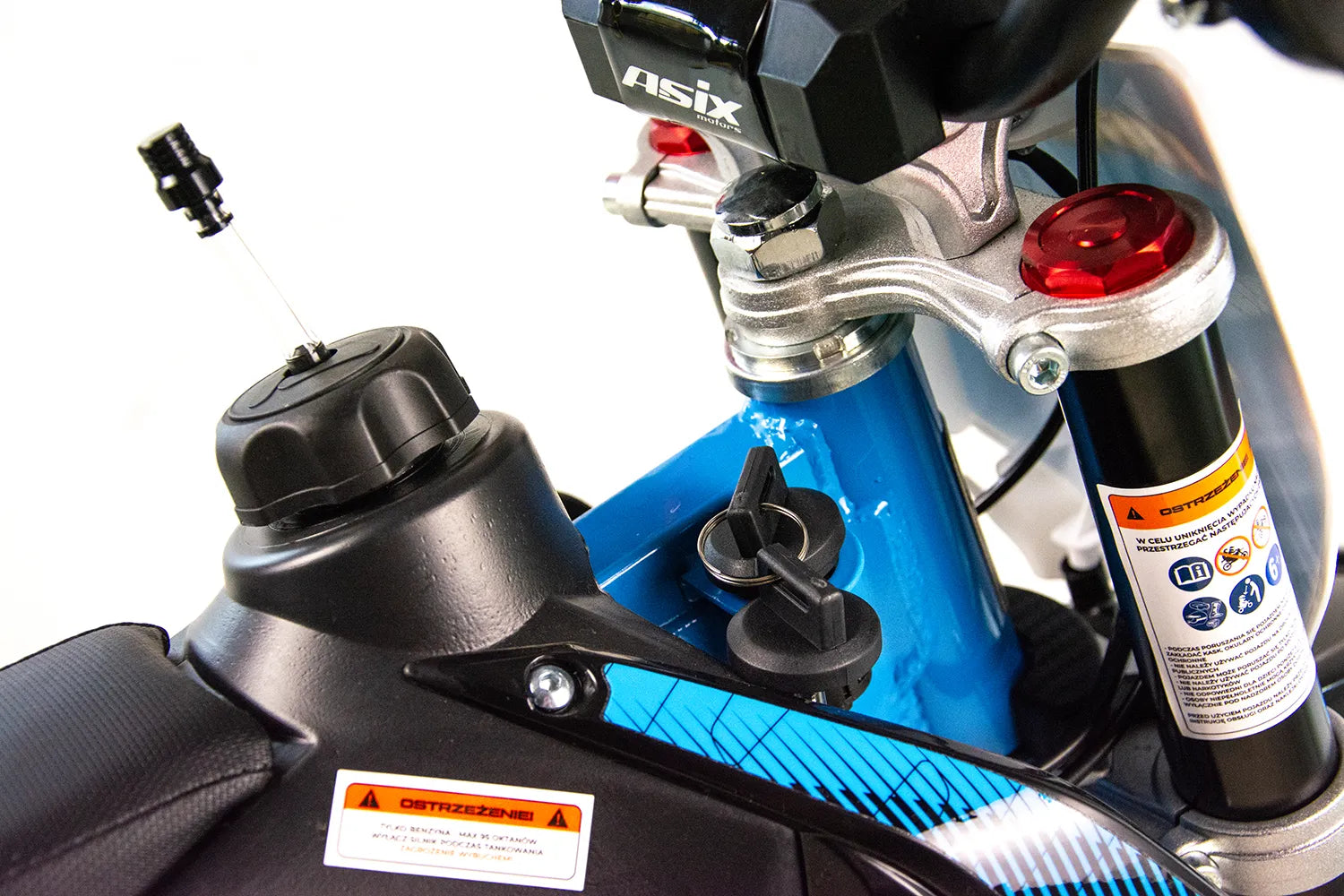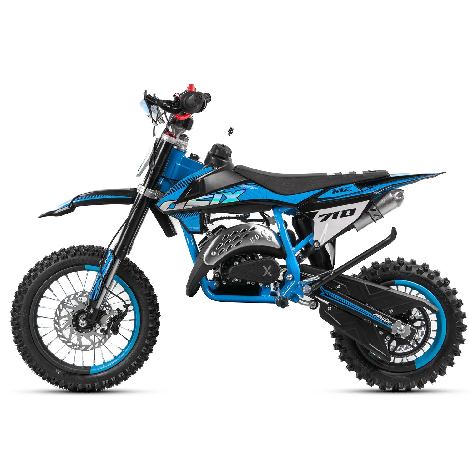 Mini cross ASIX 710 to pojazd z silnikiem dwusuwowym (2T) o pojemności 60cm3. Przeznaczony dla dzieci w wieku 6-10 lat. Cross zestawiony na kołach 12/10″, wyposażony w hamulce hydrauliczne, zrywkę bezpieczeństwa oraz amortyzatory olejowe