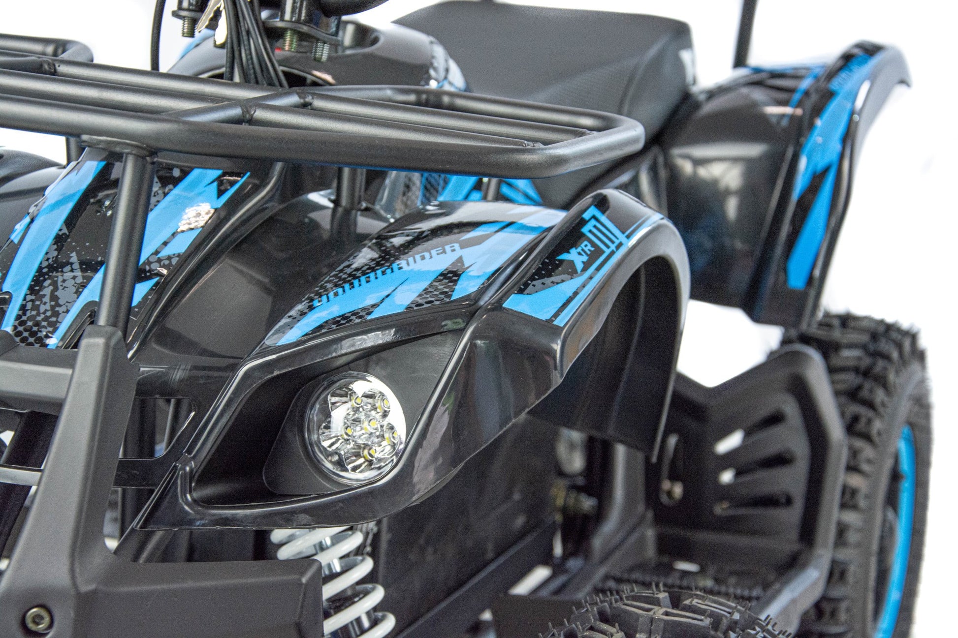 Mini quad XTR E-M7 to pojazd z silnikiem elektrycznym o mocy 1000W. Wyposażony jest w 3-stopniową regulację prędkości ustawianą za pomocą stacyjki z kluczykiem. Quad posiada bieg do przodu i wsteczny. Zestawiony jest na 6-calowych kołach, przeznaczony dla dzieci w wieku maksymalnie 8 lat