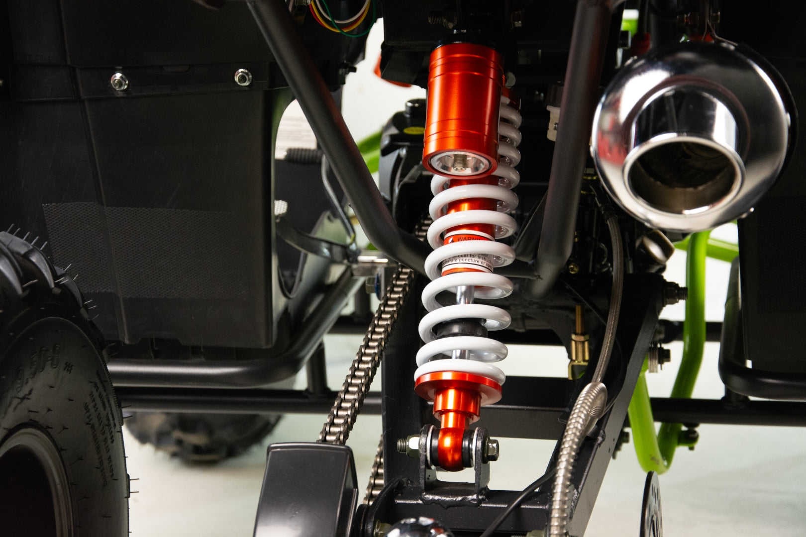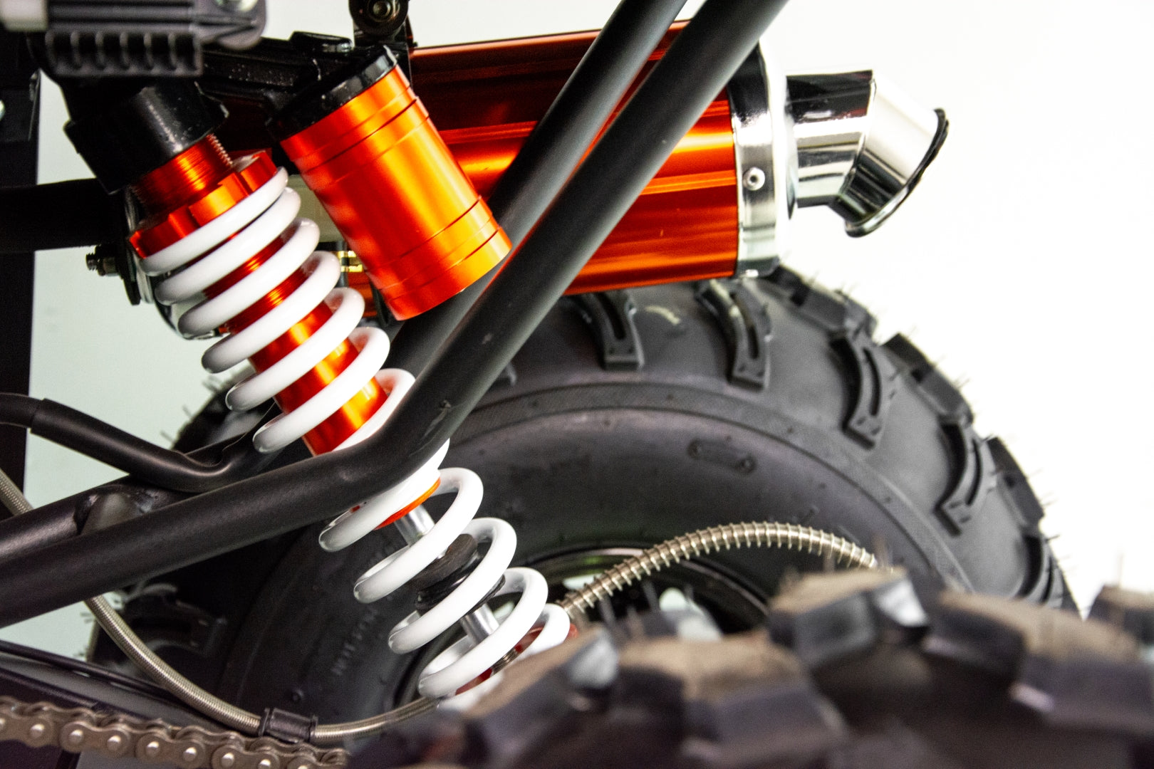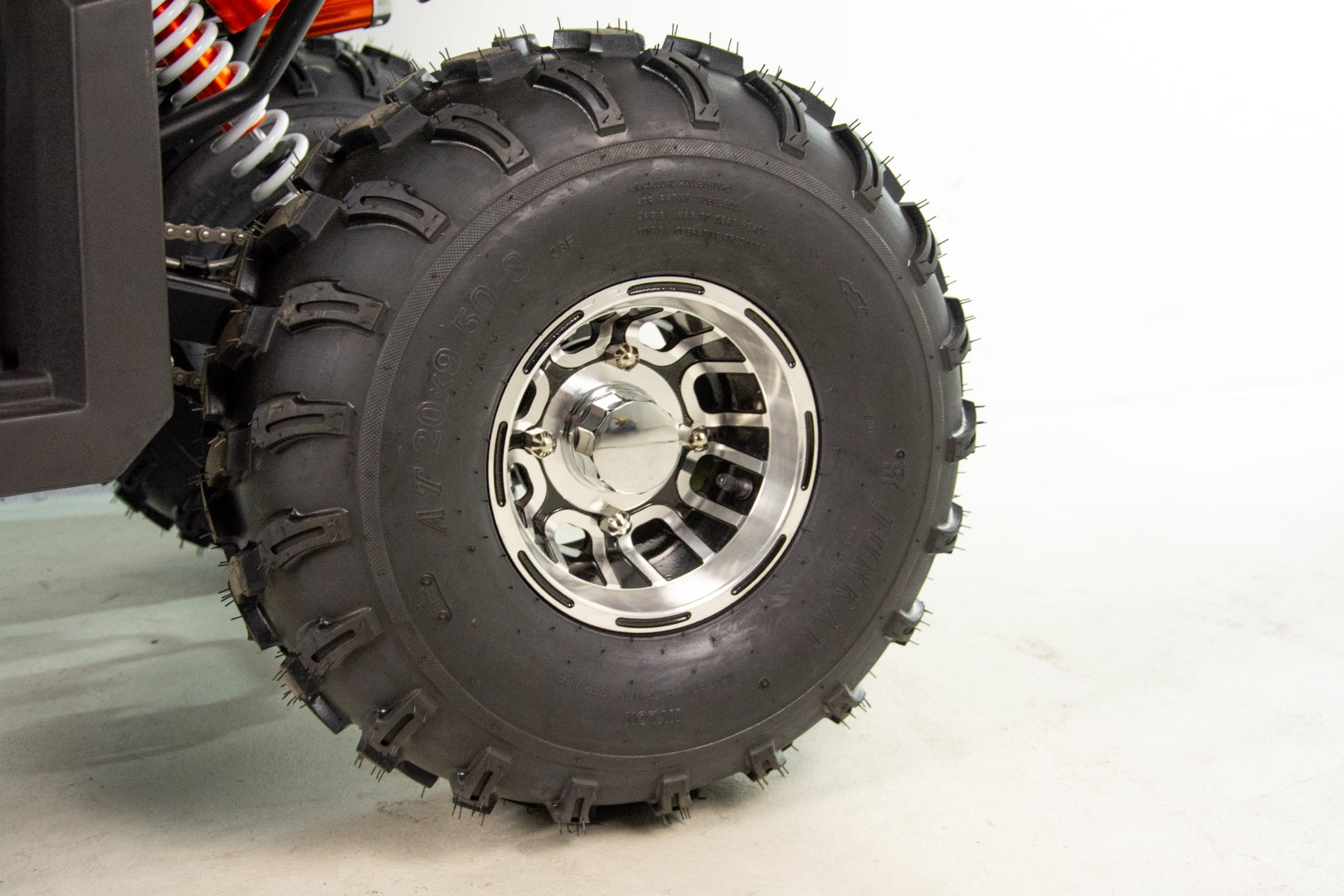 FARMER 150 zestawiony jest na dużych, 8-calowych kołach. Dzięki temu świetnie trzyma się drogi zarówno na twardej, asfaltowej nawierzchni oraz w trakcie przejazdu przez grząski teren
