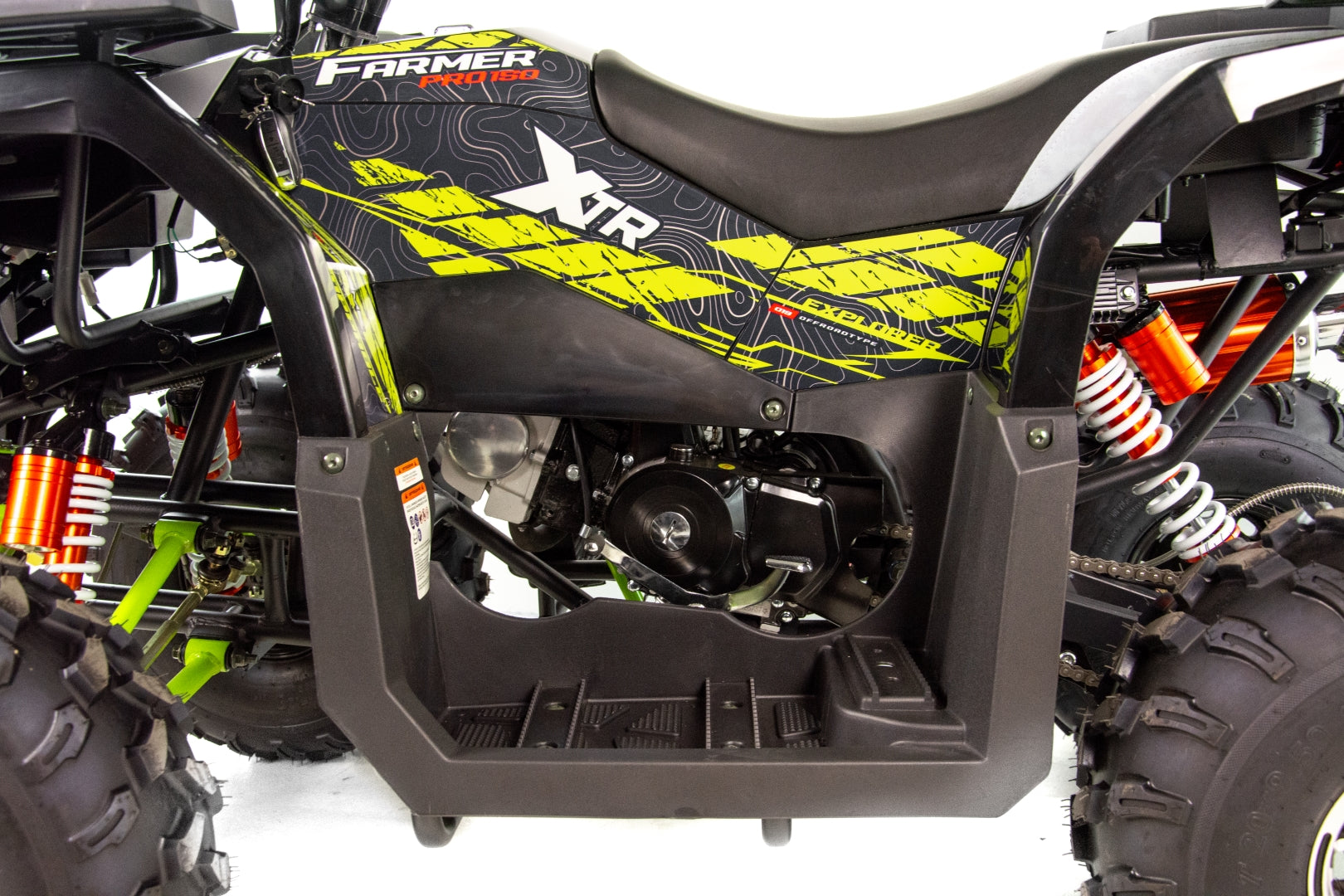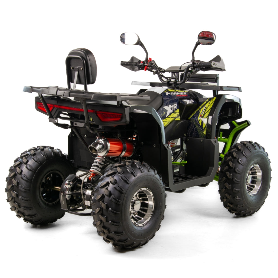 Quad FARMER 150 to pojazd dla nastolatków i dorosłych. Napędza go czterosuwowy, jednocylindrowy silnik o pojemności 150cm3. Pojazd posiada półautomatyczną skrzynię biegów z 3 biegami do przodu i wstecznym. Zestawiony jest na 8-calowych kołach z alufelgami. Wyposażony jest między innymi w licznik cyfrowy, oświetlenie LED, kierunkowskazy, hak, handbary, lusterka, oparcie