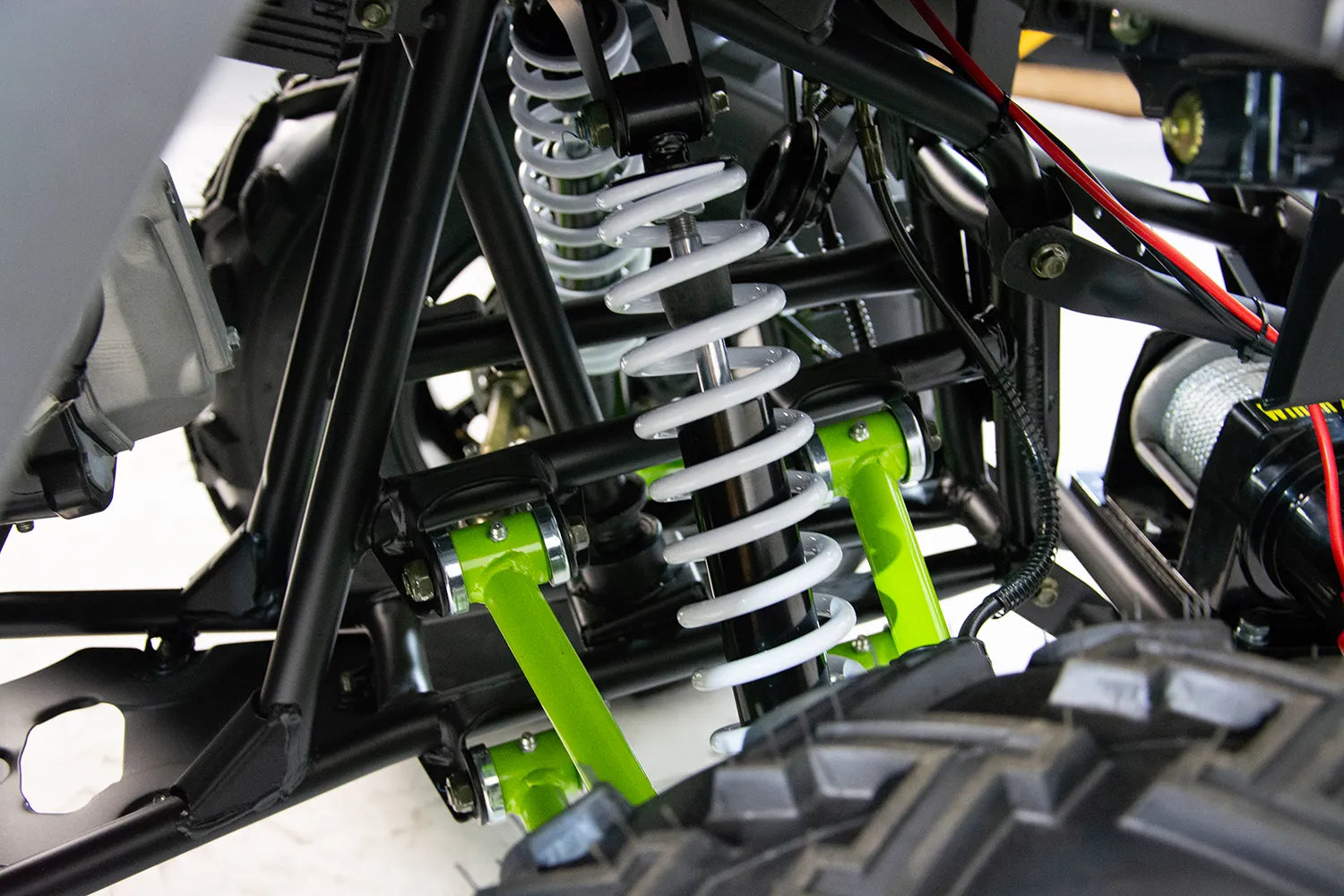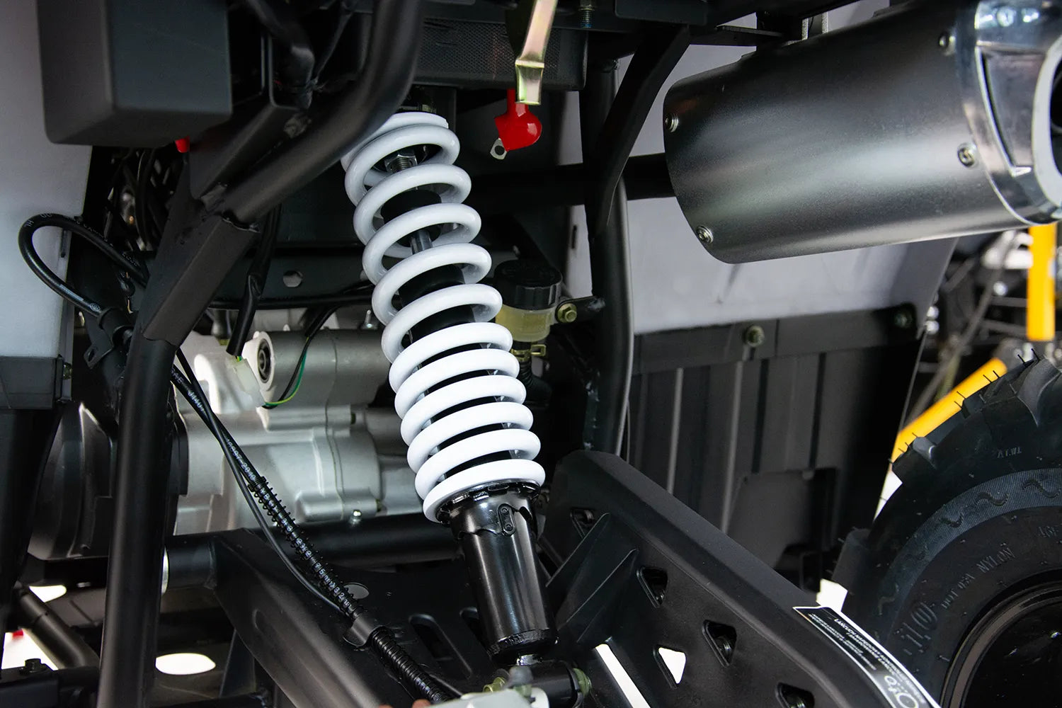 Wielowahaczowe Dual Arm ze sworzniami oraz regulowanymi amortyzatorami Dual Shock Absorber zapewniającymi płynność poruszania się w terenie przy zachowaniu odpowiedniej przyczepności. Z tyłu z kolei mamy solidny wahacz z centralnie umieszczonym, amortyzatorem Monoshock wyposażonym w regulacje twardości