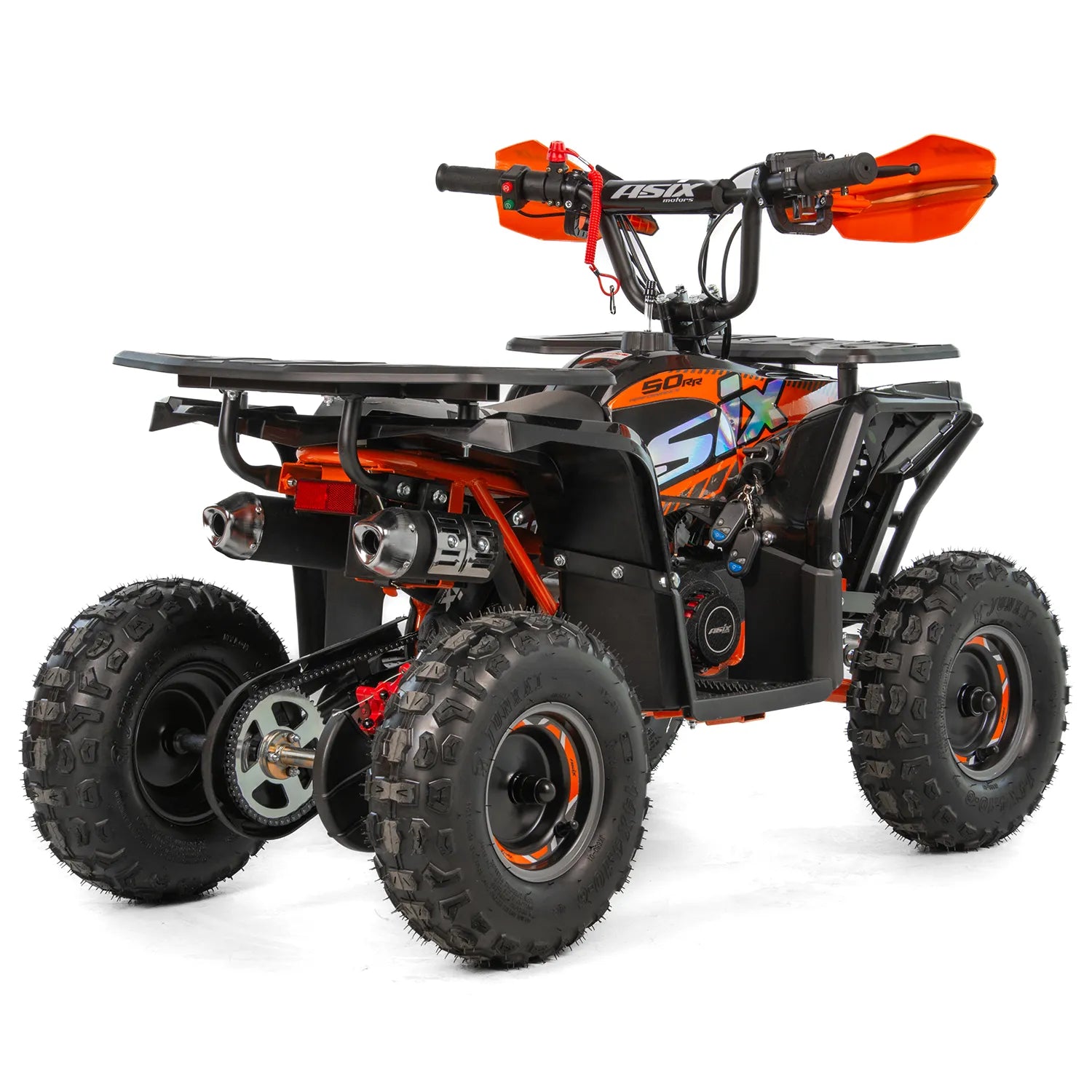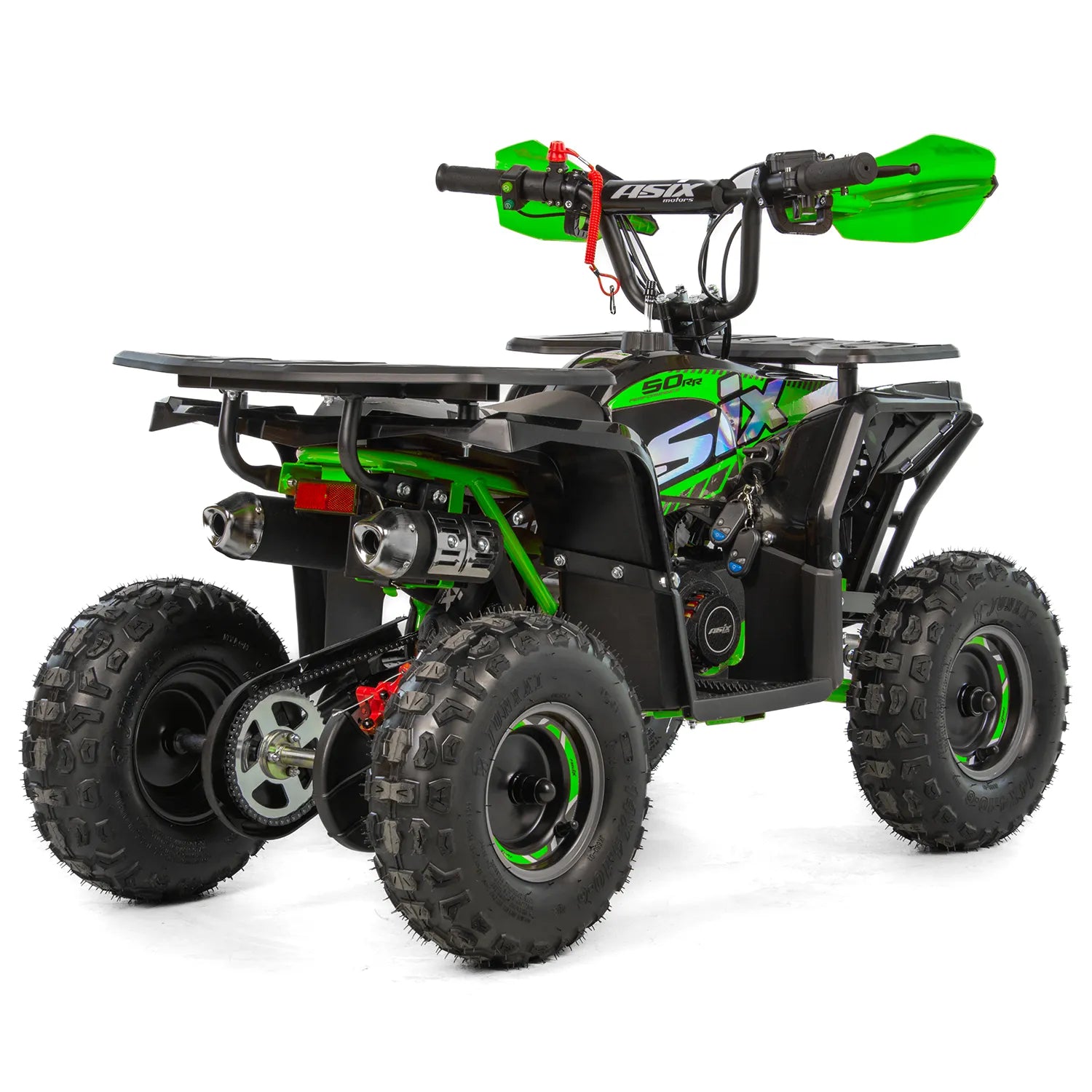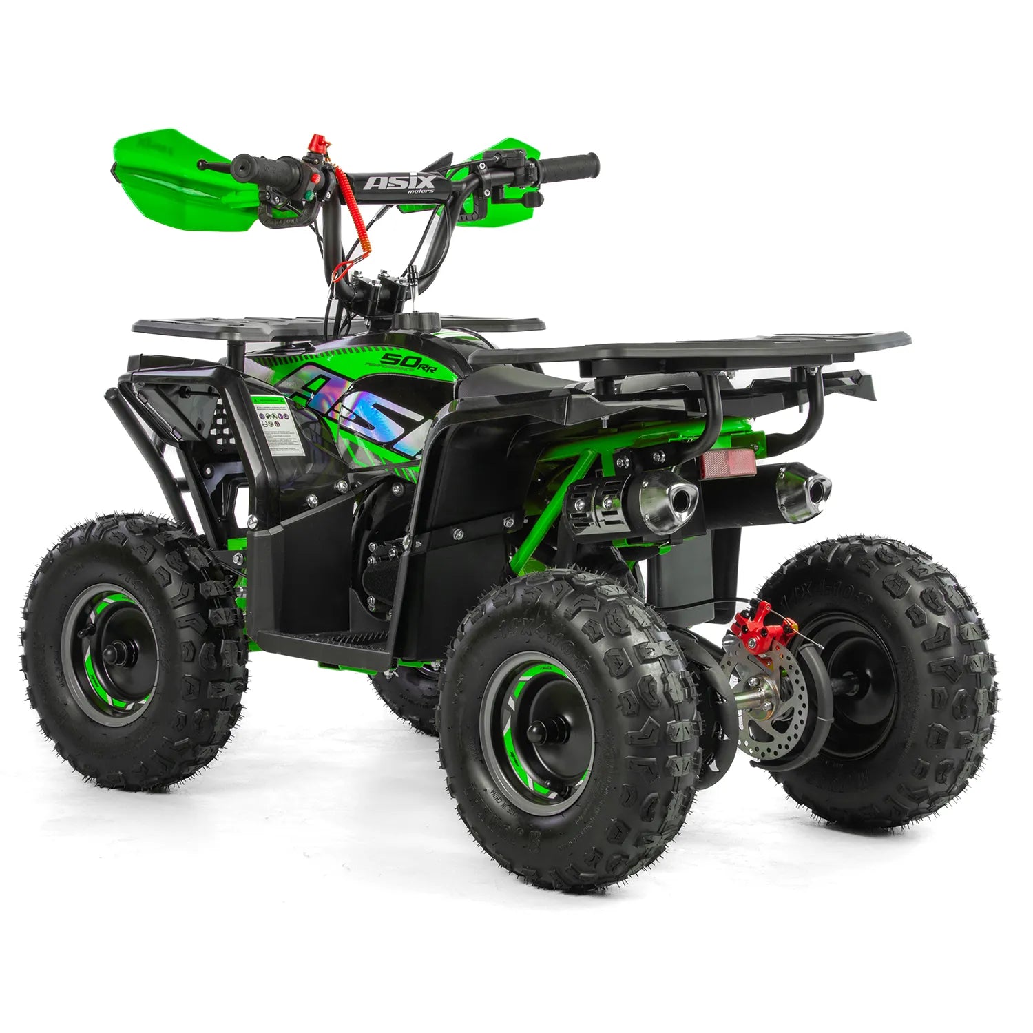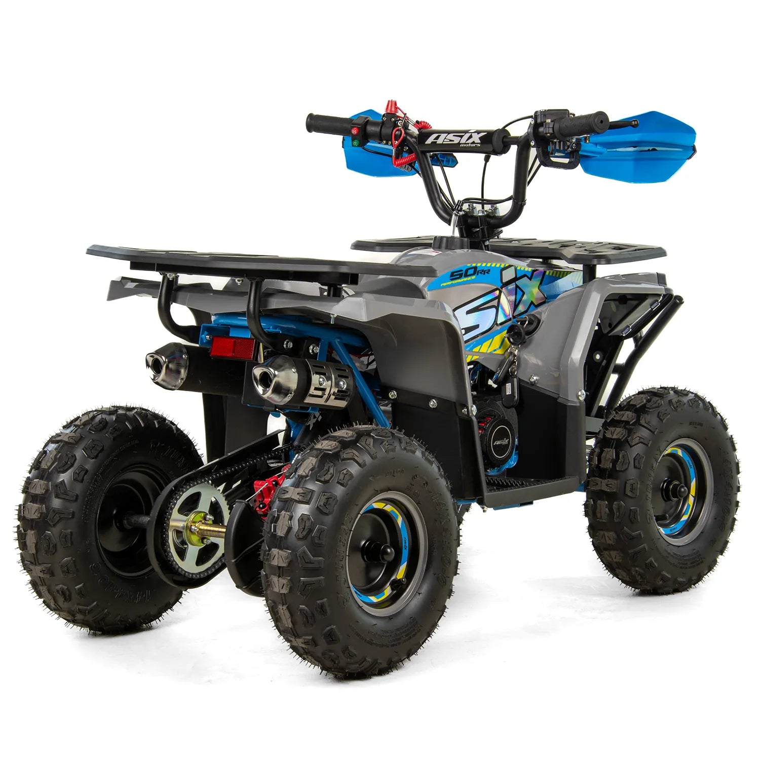 Mini quad ASIX napędza niezawodna jednostka 2-suwowa o pojemność 49cm3. Stanowi ona idealne wprowadzenie do jazdy off-roadowej dla najmłodszych. Odpalanie odbywa się za pomocą rozrusznika elektrycznego lub szarpaka easy starter