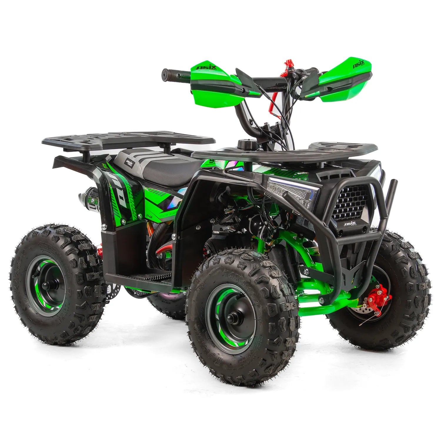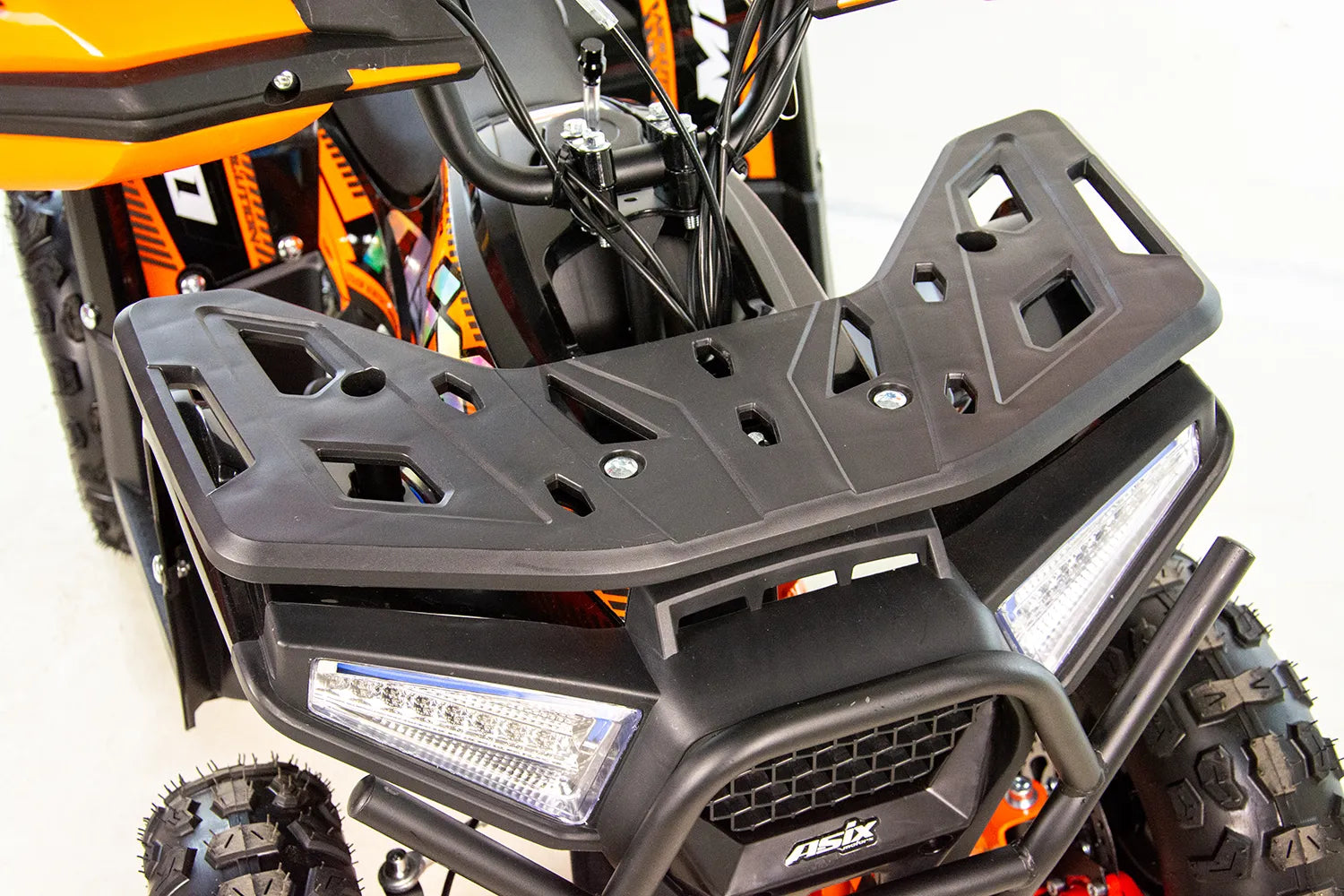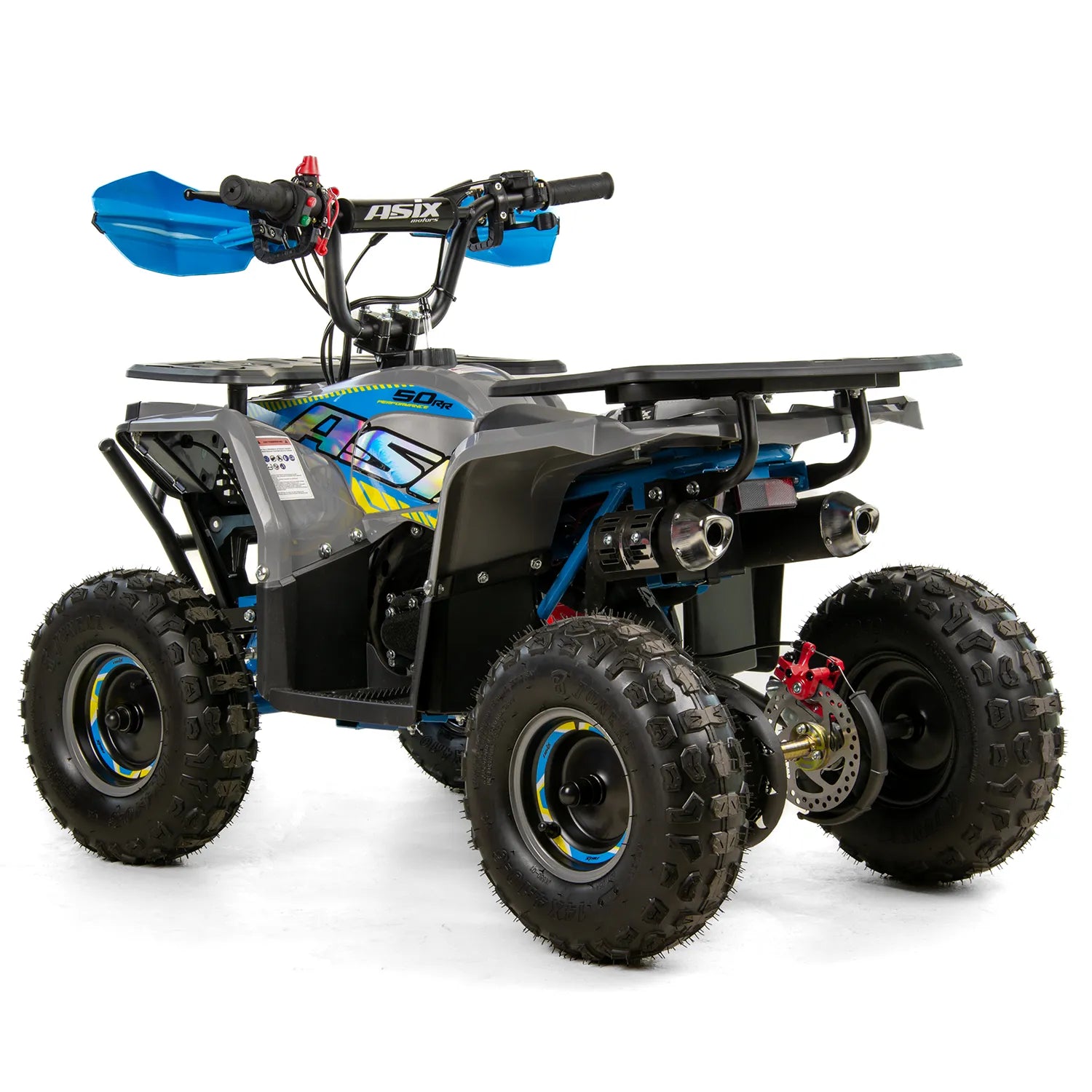 Mini quad ASIX M10 to pojazd z silnikiem dwusuwowym (2T) 49cm3 dla najmłodszych miłośników off-roadu. Model ten posiada możliwość odpalenia z rozrusznika oraz przez szarpak easy starter. Quad na dużych 6″, pompowanych kołach, wyposażony w oświetlenie LED, hamulce tarczowe, 3-stopniową regulację prędkości oraz tuningowe sprzęgło. Przeprawowy quad zaopatrzony został w 2 bagażniki z przodu i z tyłu pojazdu, które pokryte są dedykowanymi nakładkami z tworzywa