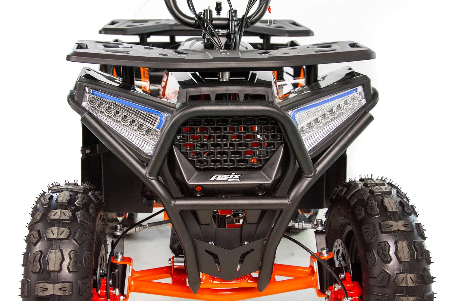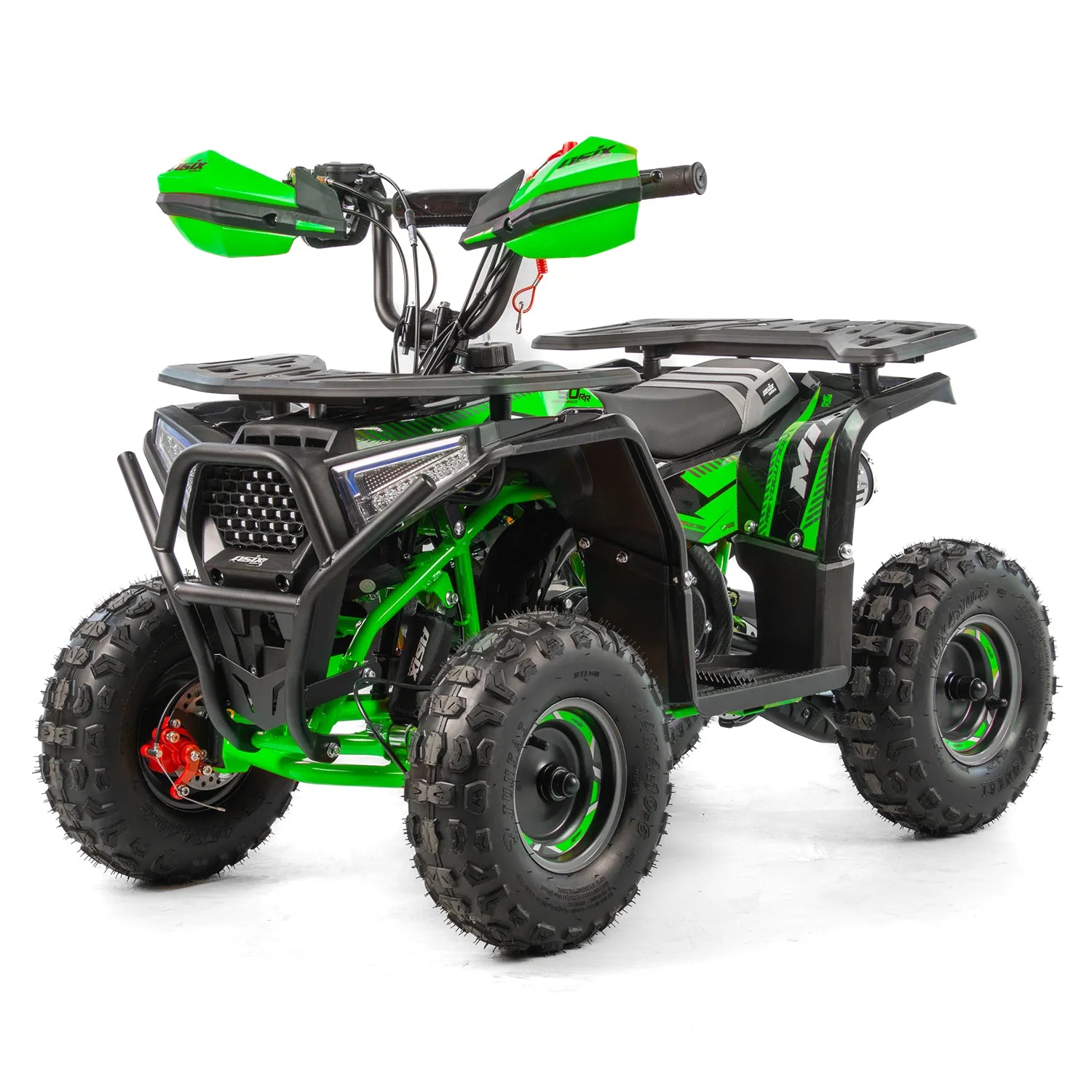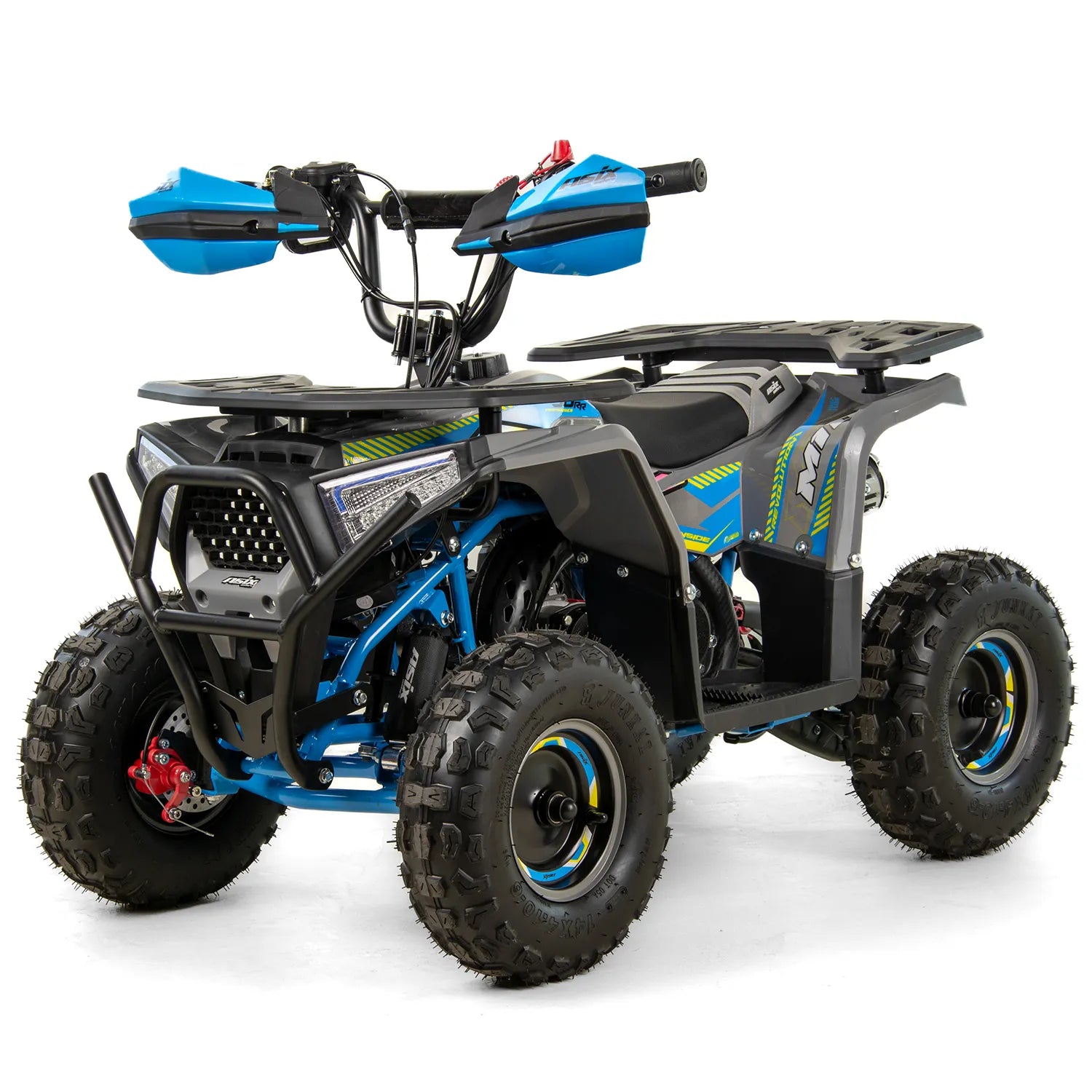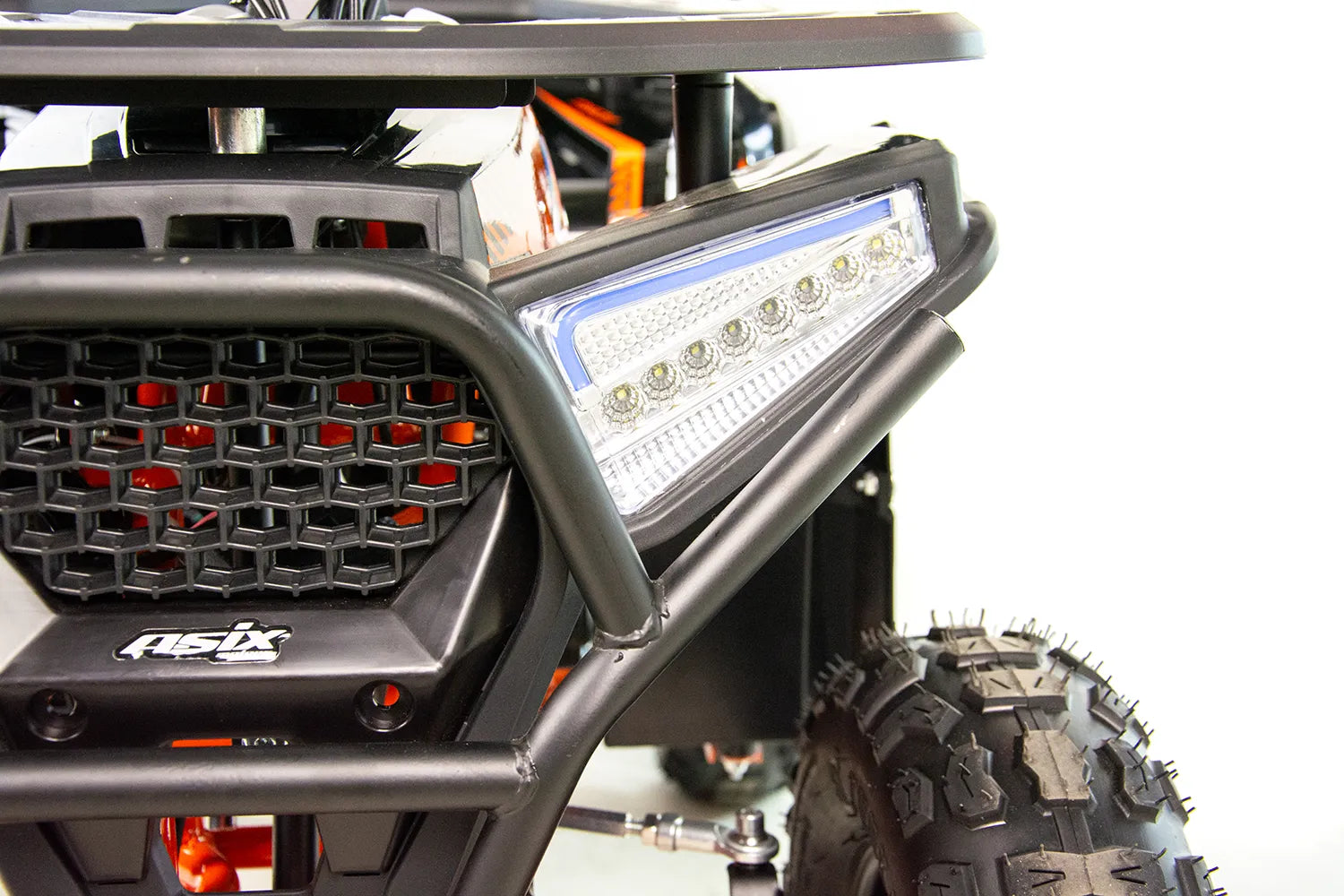 Mini quad ASIX M10 to pojazd z silnikiem dwusuwowym (2T) 49cm3 dla najmłodszych miłośników off-roadu. Model ten posiada możliwość odpalenia z rozrusznika oraz przez szarpak easy starter. Quad na dużych 6″, pompowanych kołach, wyposażony w oświetlenie LED, hamulce tarczowe, 3-stopniową regulację prędkości oraz tuningowe sprzęgło. Przeprawowy quad zaopatrzony został w 2 bagażniki z przodu i z tyłu pojazdu, które pokryte są dedykowanymi nakładkami z tworzywa