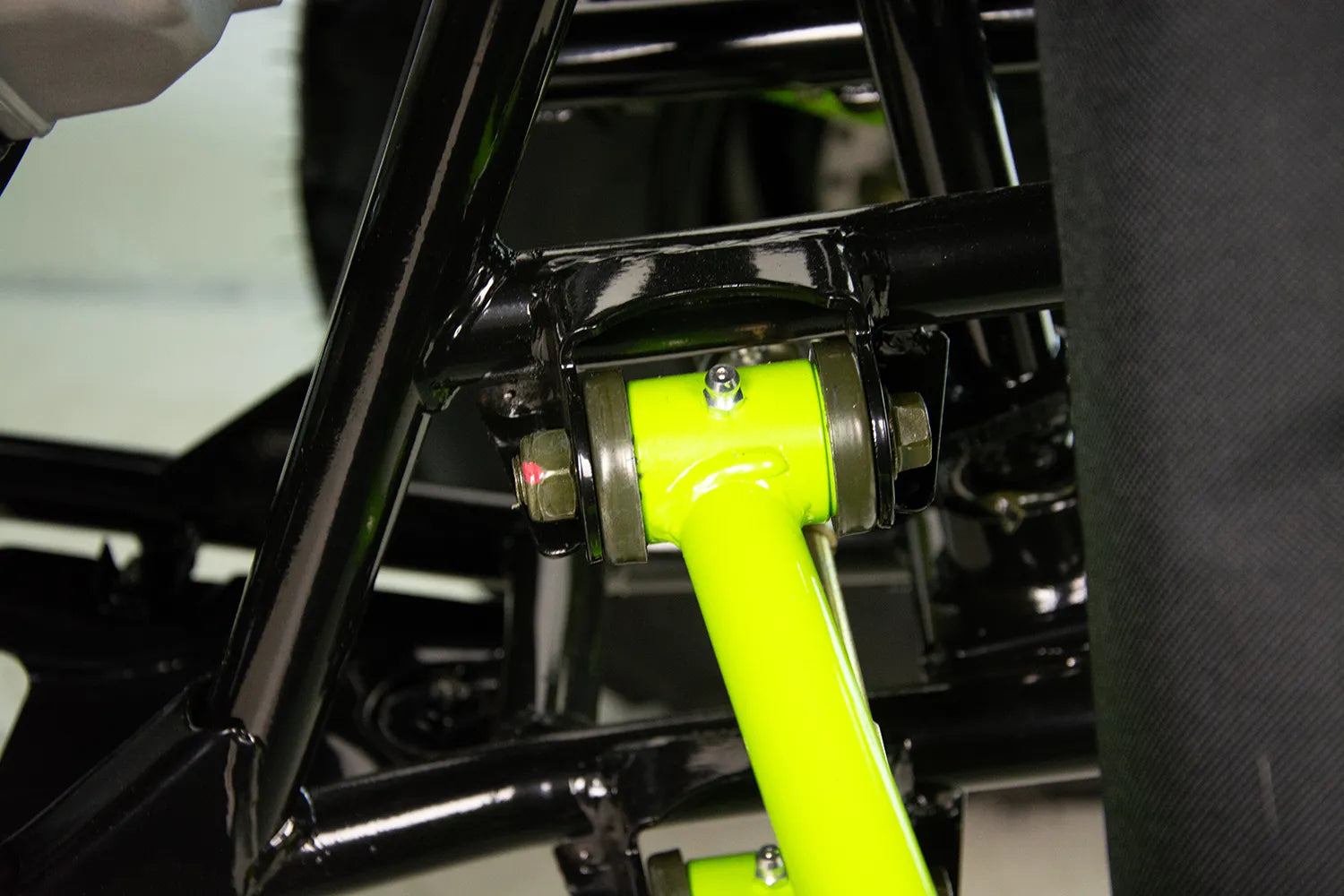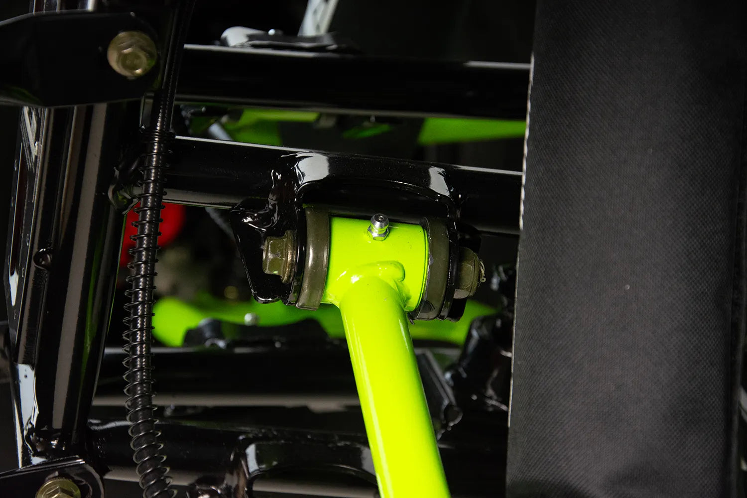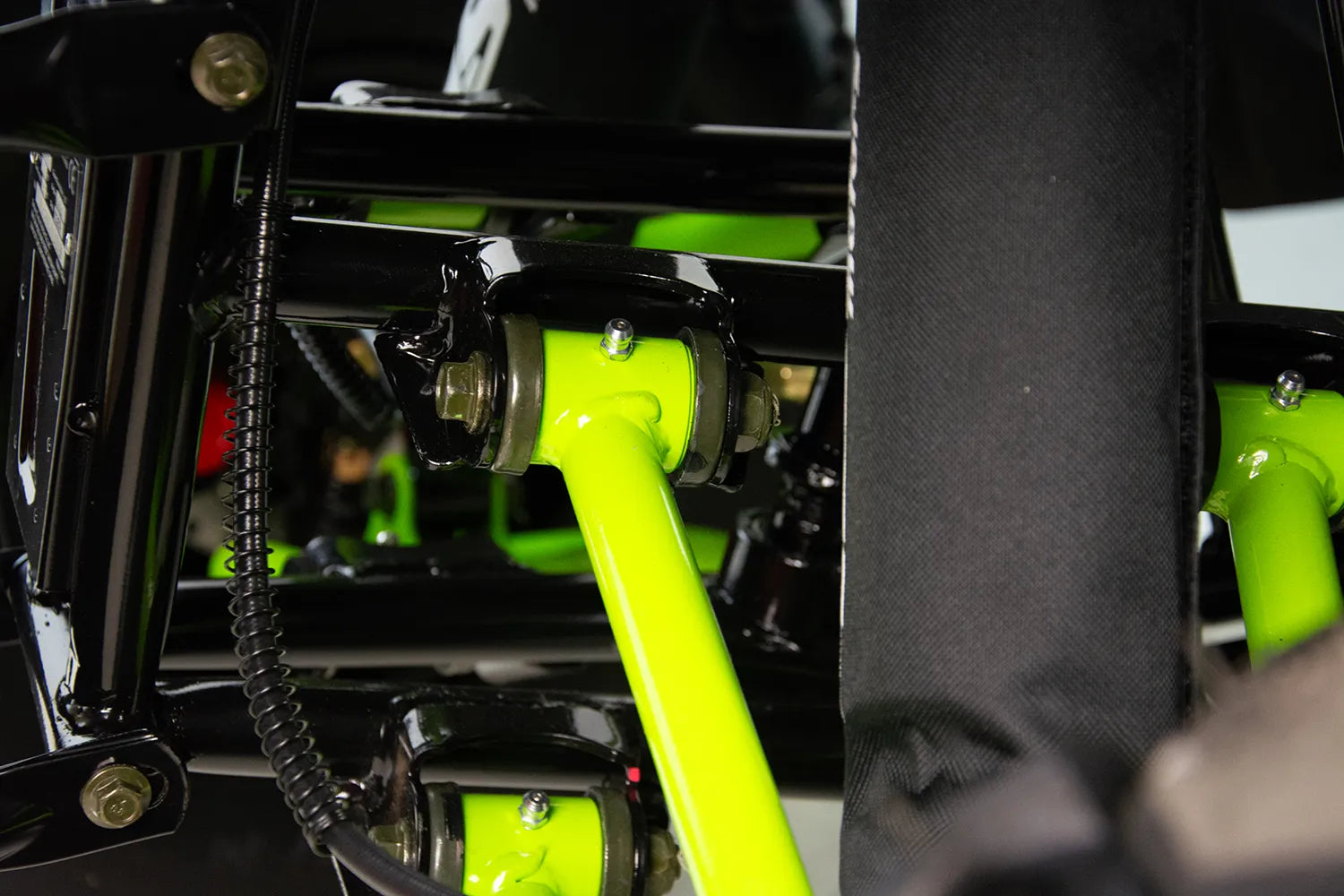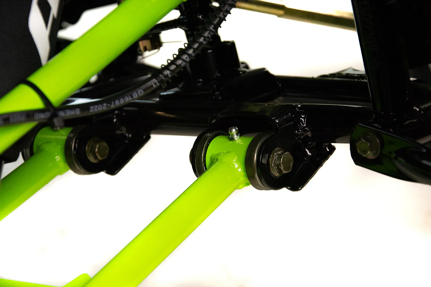 Wielowahaczowe zawieszenie przednie na sworzniach kulowych wyposażone w regulowane amortyzatory olejowe zapewniają pełną kontrolę nad pojazdem. Płynna praca zawieszenia przy zachowaniu odpowiedniej przyczepności pozwoli w pełni cieszyć się pokonywaniem bezdroży